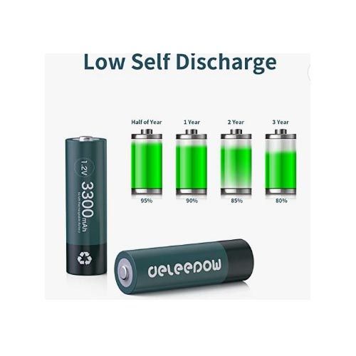 Deleepow Baterías AA recargables, batería AA NiMH de alta capacidad de 3300 mAh, 1200 ciclos de 1,2 V, baterías dobles A precargadas, baja autodescarga