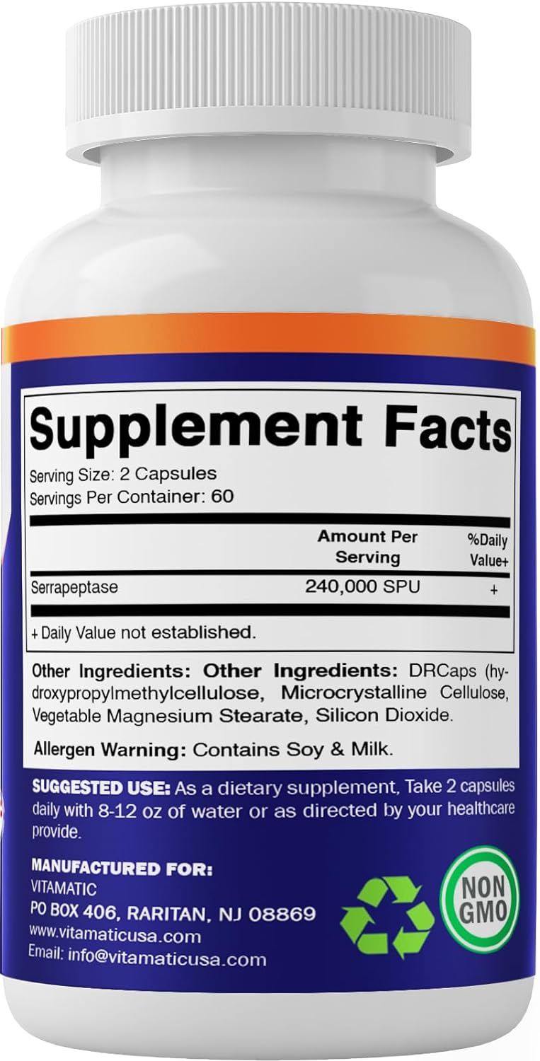 Vitamatic Serrapeptase 240,000 porciones de SPU, 120 cápsulas de liberación retardada – Sobrevive a los ácidos estomacales – Enzima proteolítica para senos nasales, respiratorios y articulaciones – Sin OMG y sin gluten – Fabricado en los Estados Unidos
